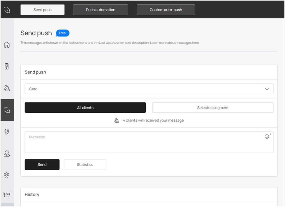 - Send push - this tab allows you to send push messages to all clients or a selected segment and to view the history of sending.