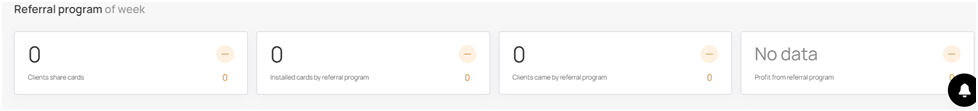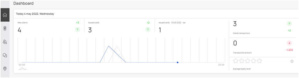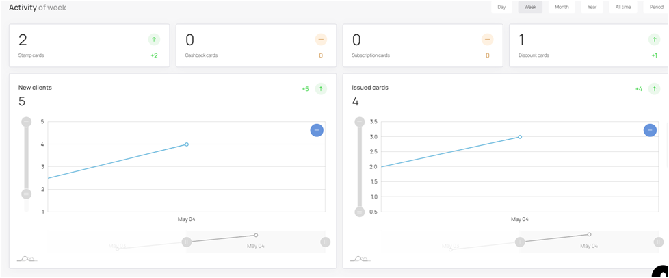 - Statistics - here you can view the client activity for the selected period. Number of new clients, number of issued cards, as well as information on referral program.