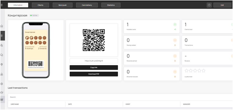 - Information - this displays the QR code and link to install the card, the number of cards installed, the number of customers in the base, information about discounts/stamps accrued (depending on the type of card), and transactions. There is also details on the last transactions