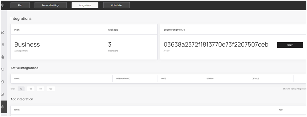 - Integration" tab. Integration is available only on "Maximum" tariff plan.