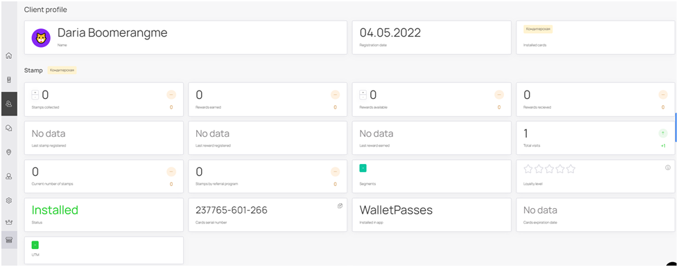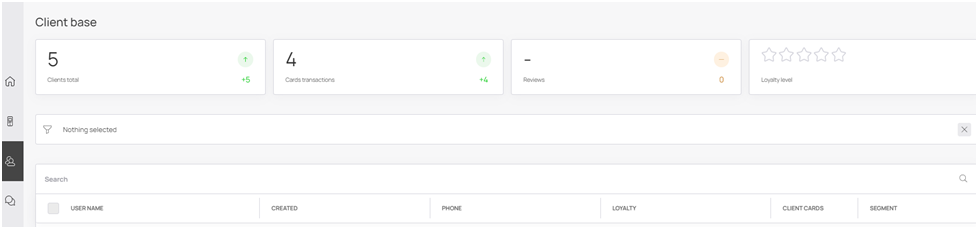 - Clients - details of clients who have the selected card installed. Number of customers, transactions, reviews and loyalty level. There is an option to search for customers.