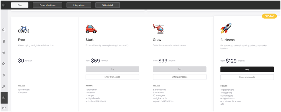- Tab "Tariff plan". It contains information about the current tariff plan, the date of charging, and payment history. You can also find the overview of the full functionality of all available plans.