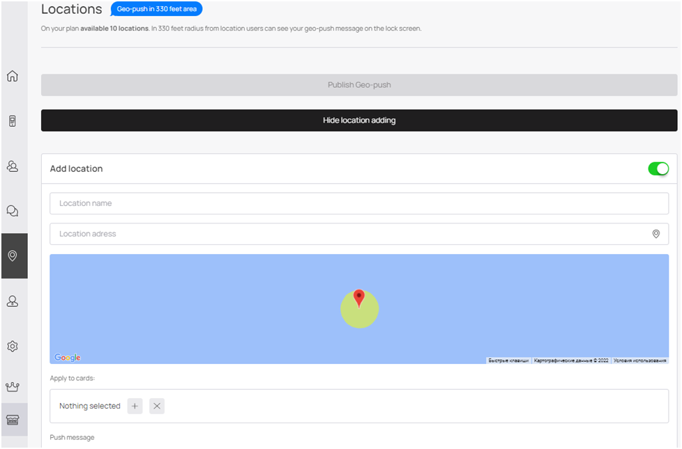 In this section you can configure geo-push notifications to be sent. Within 330 feet of locations, users with maps will have a push message on their smartphone screen. This feature is implemented for tariffs above Free.