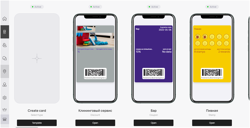 Boomerangme personal cabinet consists of the following sections that allow you to issue, set up and work with virtual loyalty cards: