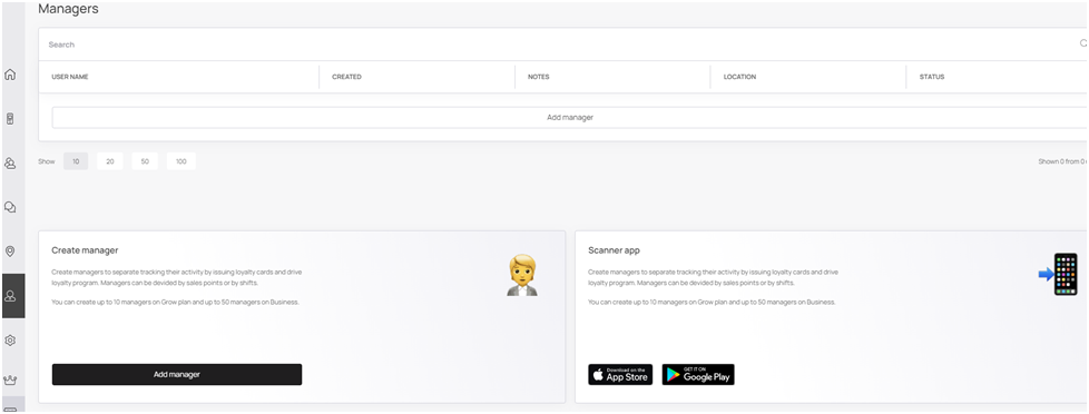 In this section, you can create managers to separately track the effectiveness of card issuance and stamp accrual. Managers can be distributed by sales outlets or by shifts. Manager has its own access to the scanner of the mobile application. For each manager there is a separate statistics of accruals.