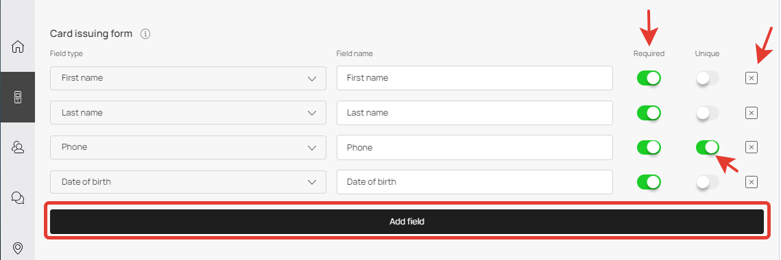 You can select the mandatory fields in the form by activating and deactivating the checkbox on the right. You can also set which of the fields should be unique. We recommend that you leave only the phone number unique.