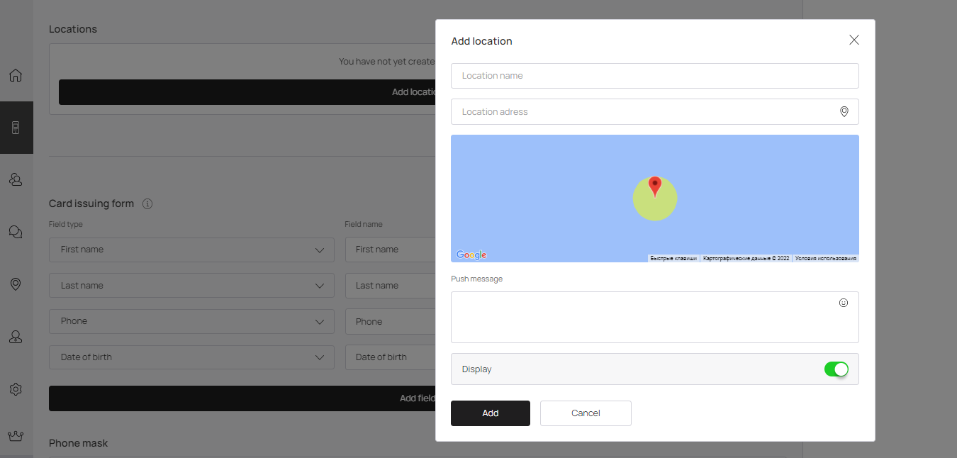 Here you can set up a location for the card to send geo-push notifications. Within 330 feet of locations, users with card will have a push message on their smartphone screen.