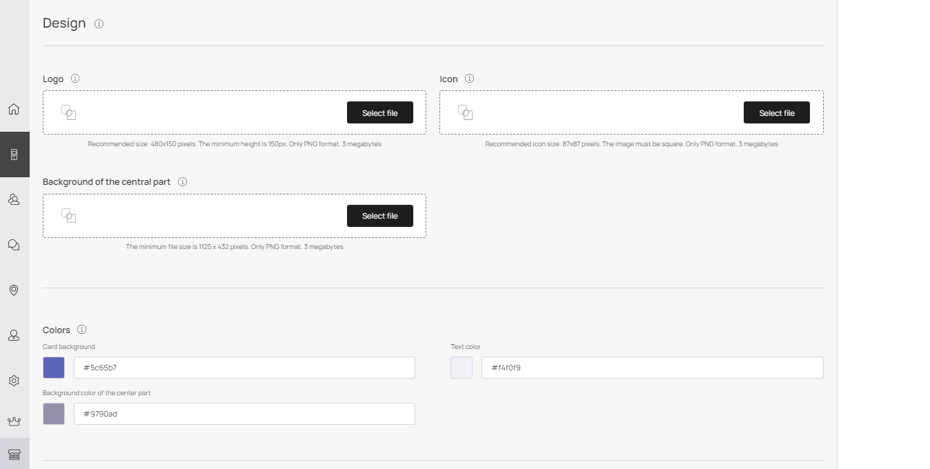 In this section you load your logo, icons, the background of the central part and the choice of colors.