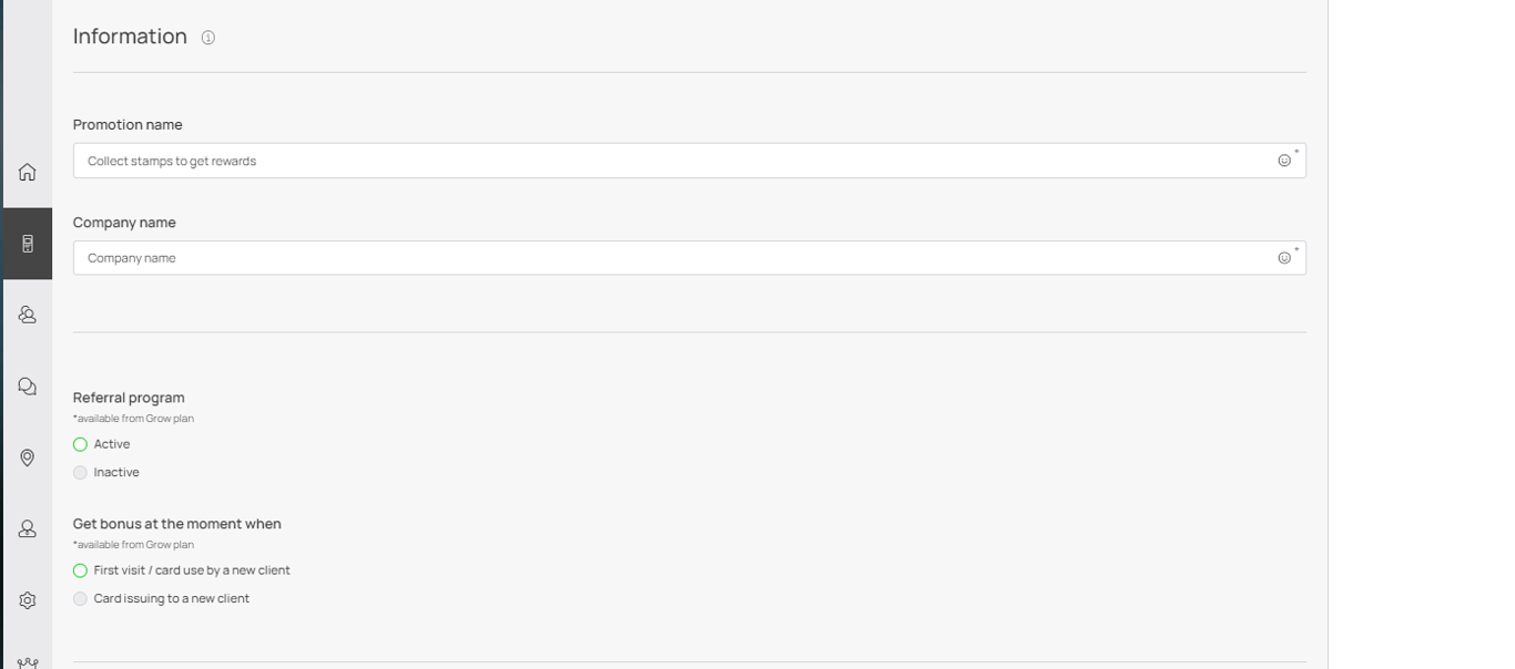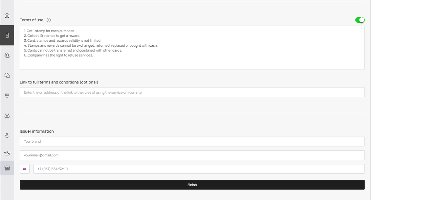 - Terms of use - brief terms and conditions for using the loyalty card. Describe the main points of your program.