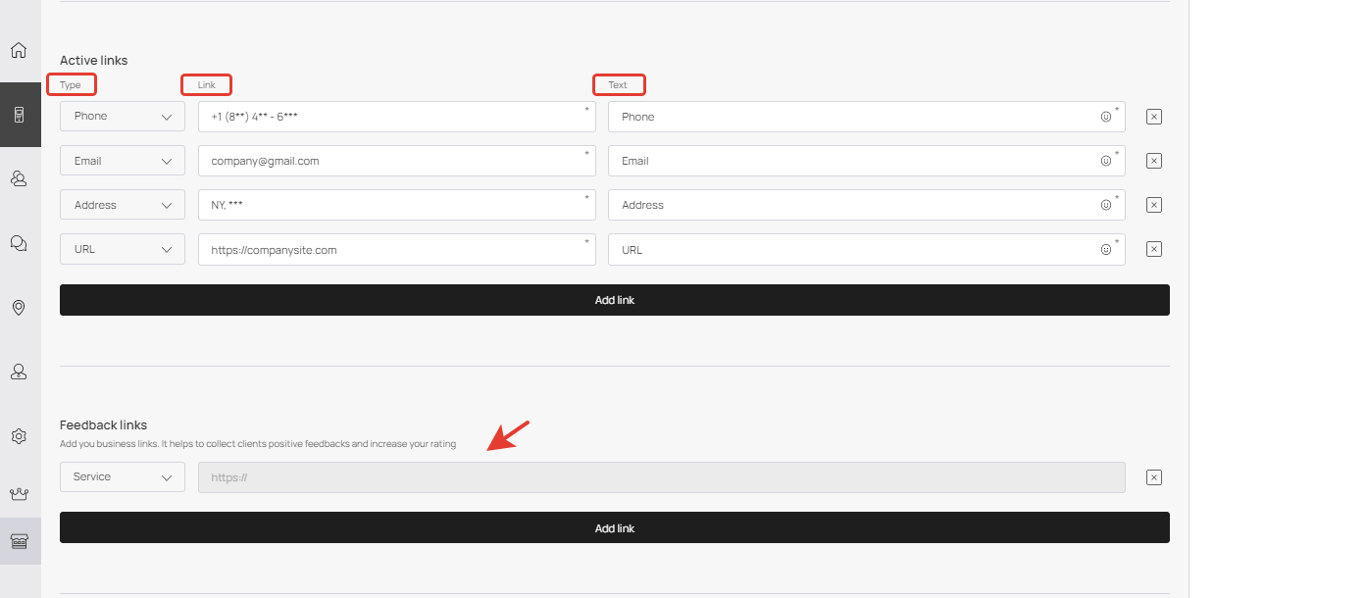 - Active links - your contact information: address, phone, email, URL. Will be displayed as clickable links in the text that you specify in the details of the card.