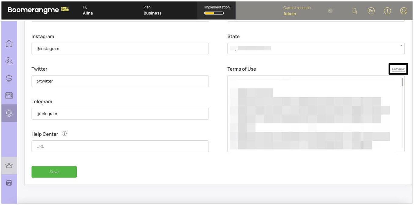 e) Agency information (the information about you that sub-accounts can check + you can add your terms of Use)