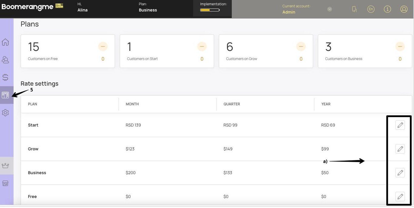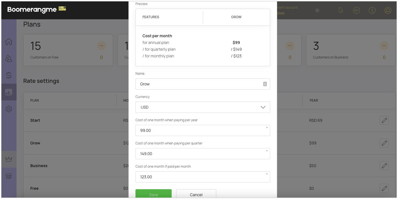 You can change currency, set up the cost per month for the annual/quarter/month plan, change the tariff’s name, and see the preview