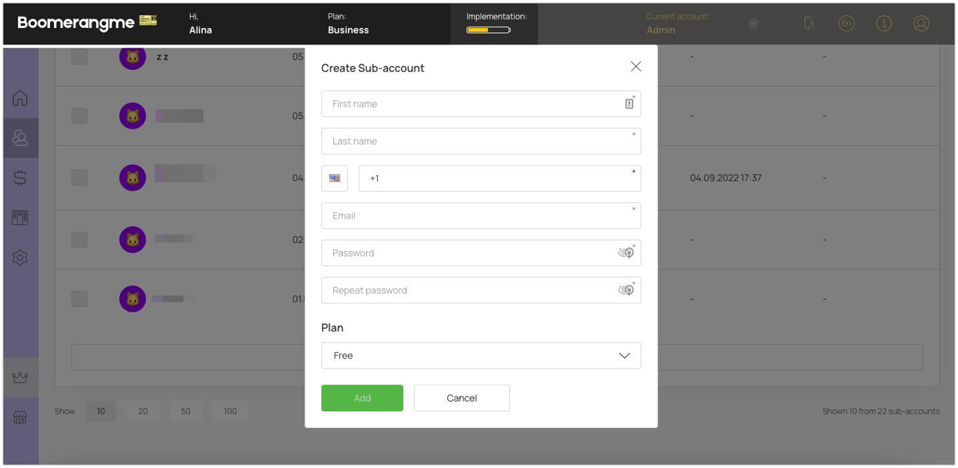 You will need to enter the subaccount’s information (First Name, Last Name, Phone number, Email address, password), choose the Plan and click on add.