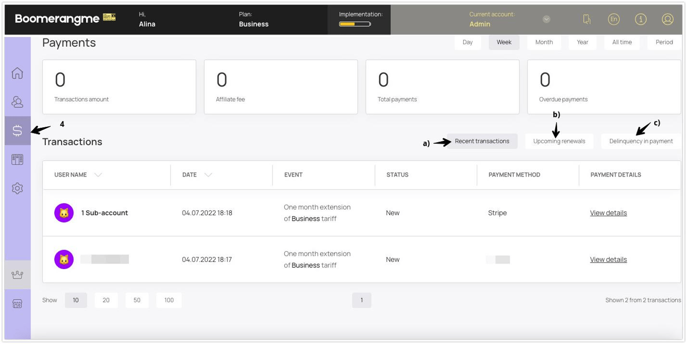 4. When you switch to the “Payments” section, you can see transaction details and choose daily, weekly, monthly, yearly, all-time’s, and period statistics for sub-sections: