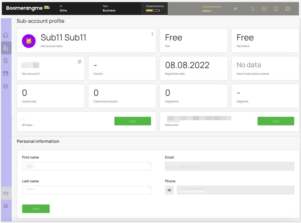 If you click on the user’s name, it will switch to the subaccount’s profile page where you can check the customer’s business, personal information, and the latest transactions: