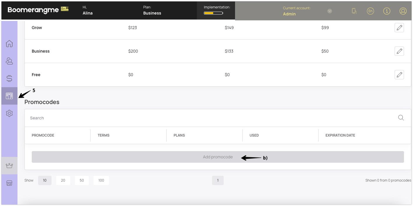 b) Currently, the option “Add promo codes” is developing, and it’s inactive