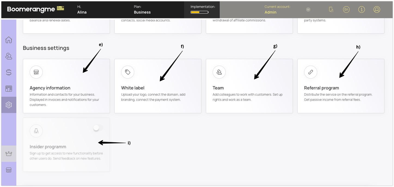 g-h-i) “Team”, “Referral Program” and “Insider Program” options are developing. Hope for your understanding!