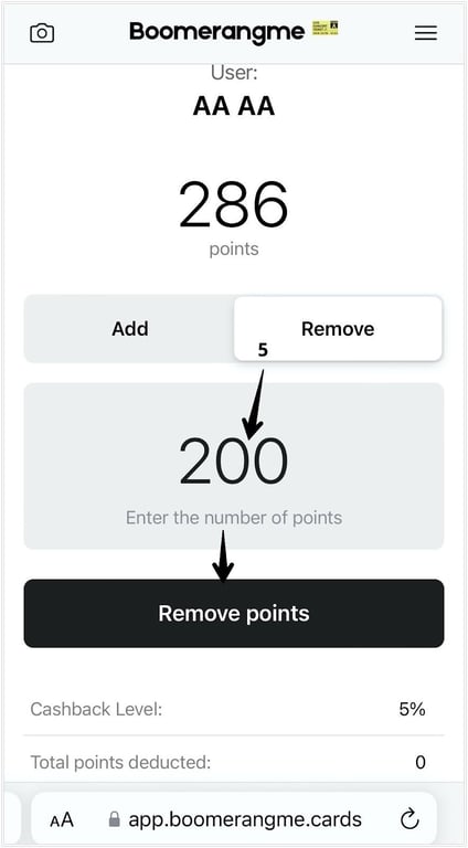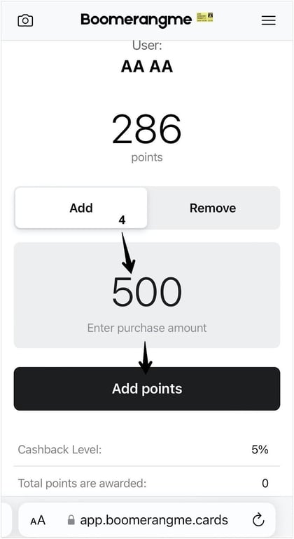 4. Enter the purchase amount, click on “Add points” and confirm (the system will calculate the % automatically according to the purchase amount)